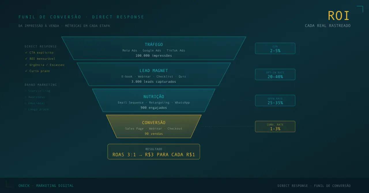 Meça tudo. Custo por lead, custo por venda, ROAS. Se não está medindo, não está fazendo direct response — está fazendo esperança.