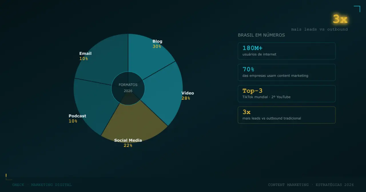 Marketing de conteúdo gera 3x mais leads por real investido que outbound tradicional, e 70% das empresas brasileiras já o utilizam (Rock Content / Content Trends). Mas a maioria produz sem estratégia — publicando por publicar, sem medir resultados, sem distribuir, sem atualizar. Em 2026, as 5 estratégias que movem o ponteiro são: conteúdo com IA (como acelerador, não substituto), vídeo curto (Brasil é top-3 TikTok e 2º YouTube), podcasts de nicho (profundidade > escala), SEO + conteúdo integrado (o Google exige qualidade + técnica) e UGC/comunidades (o público cria e valida). As ferramentas estão mais acessíveis do que nunca — de Canva e CapCut gratuitos a Semrush e mLabs para quem quer escalar. O framework é: audiência precisa, temas-pilar, 2 canais principais, calendário realista e métricas que importam (leads e receita, não likes). A saturação de conteúdo genérico é real. A escassez de conteúdo relevante também. A diferença entre as duas é estratégia.